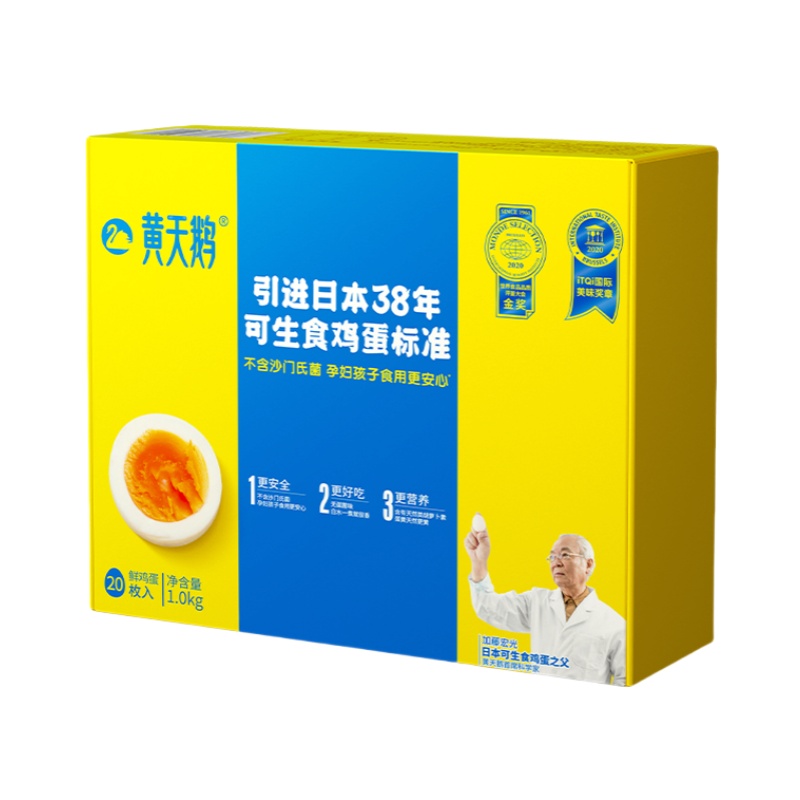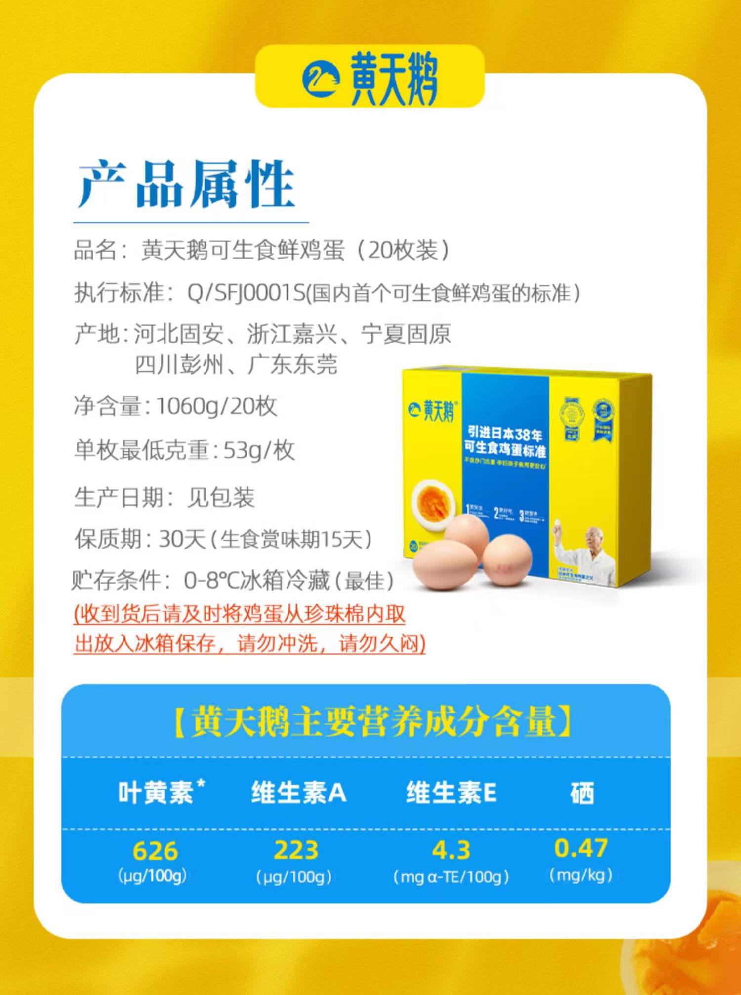 商品名称:(世星阳光)+黄天鹅 可生食鸡蛋20枚1.06kg盒 不含沙门氏菌 日本标准可生食鸡蛋 无菌新鲜鸡蛋