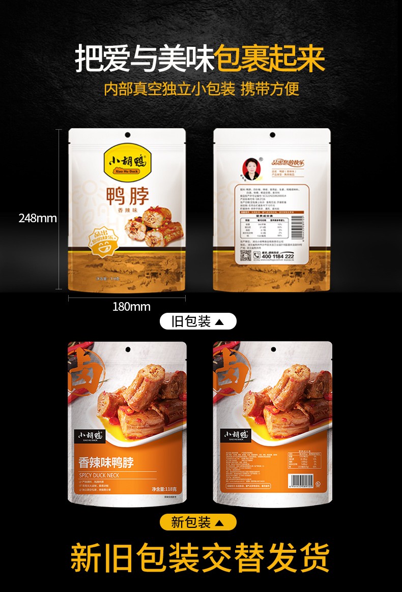 商品名称:(巨邦佑)BJ+小胡鸭香辣味鸭脖118g*2 卤味即食零食