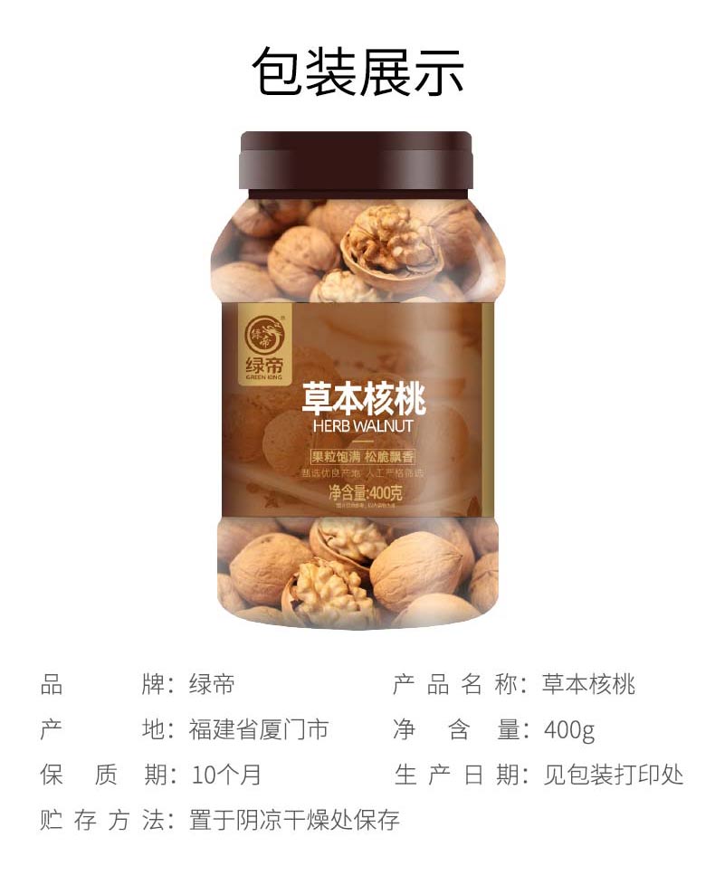 商品名称:(世星阳光)绿帝草本核桃400g 每日坚果炒货休闲零食草本核桃