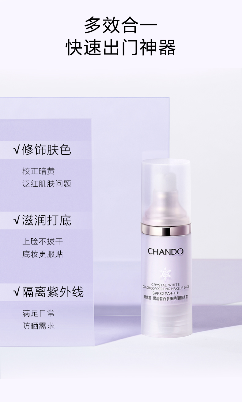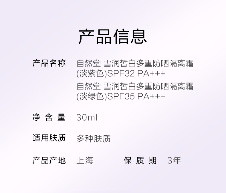商品名称:(世星阳光)自然堂雪润皙白多重防晒隔离霜(淡紫色)SPF32PA+++ 30ml 多效合一 快速出门 滋润打底 上脸不拔干 底妆更服贴 特调保湿配方 滋润亲肤
