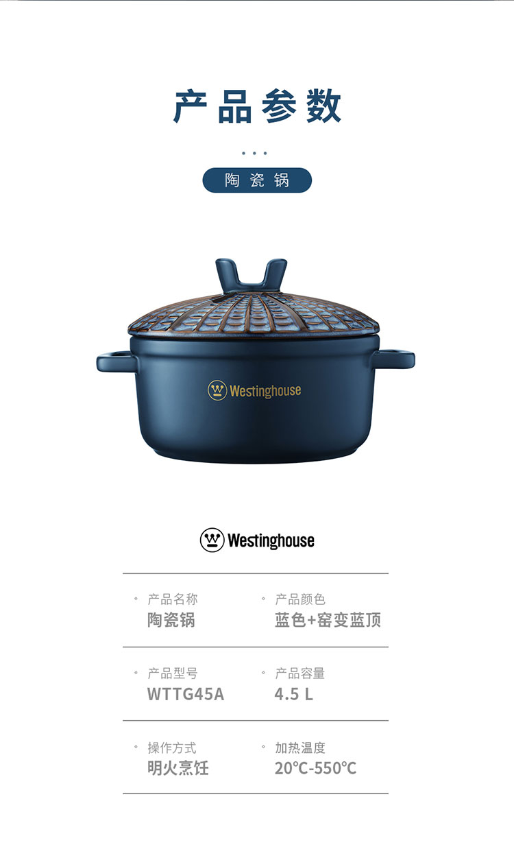 商品名称:(世星阳光)+WY西屋 陶瓷锅 4.5L WTTG45A 天然原料 高温煅烧 骤冷骤热 不易开裂