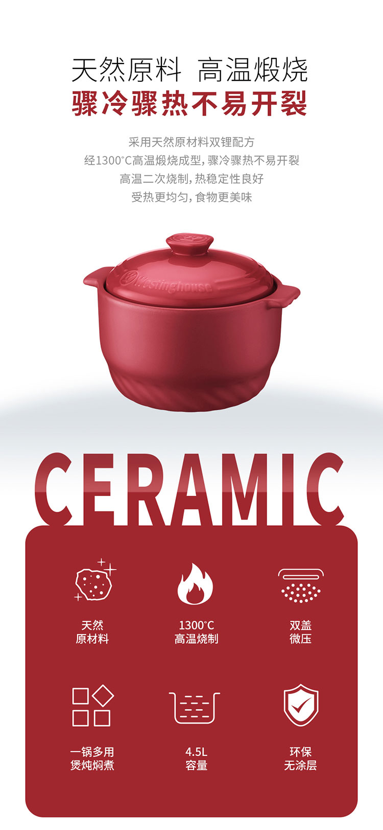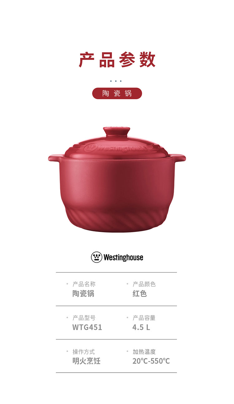 商品名称:(世星阳光)+WY西屋 陶瓷锅 4.5L WTG451 骤冷骤热 不易开裂 无重金属析出 安心烹饪每一顿美味