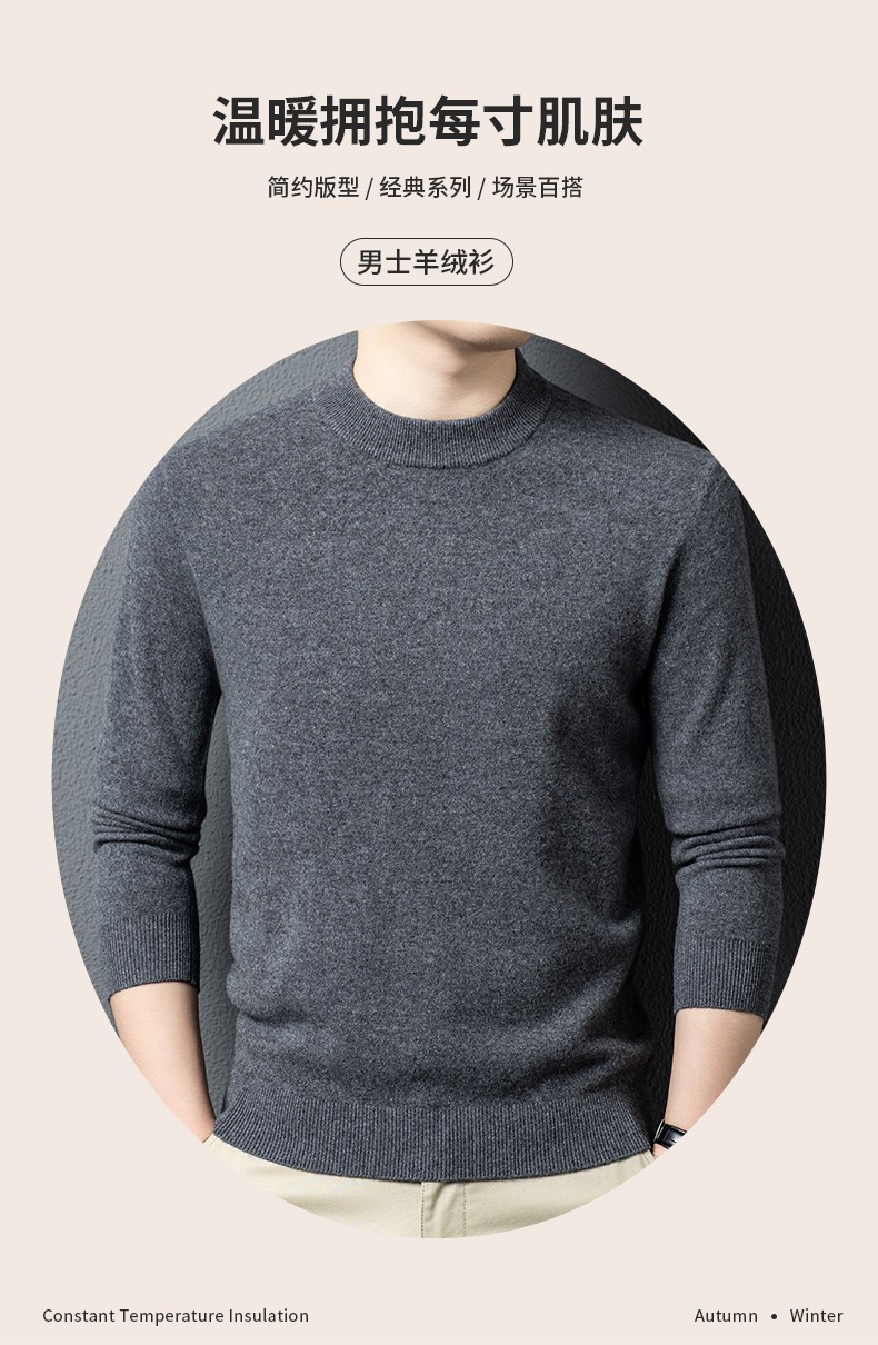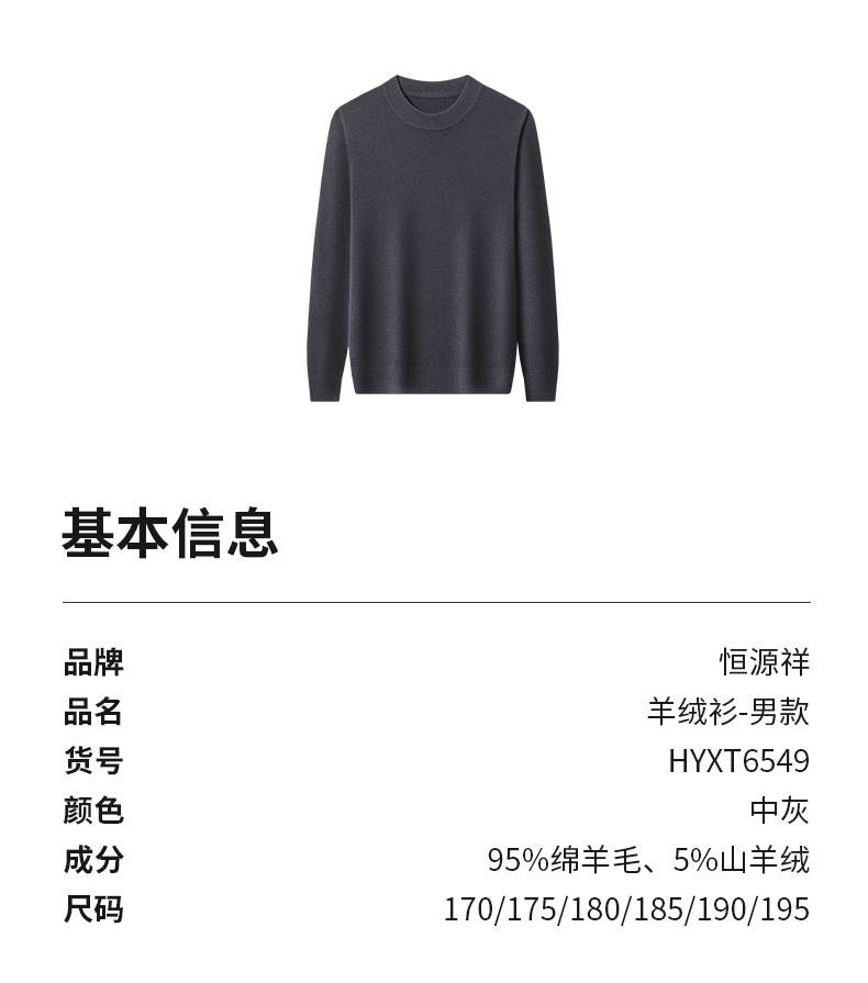 商品名称:(世星阳光)+恒源祥 羊绒羊毛衫 HYXT6549 规格 170 175 180 185 190 195 颜色 中灰 男款 下单备注尺码 轻盈透气 保暖