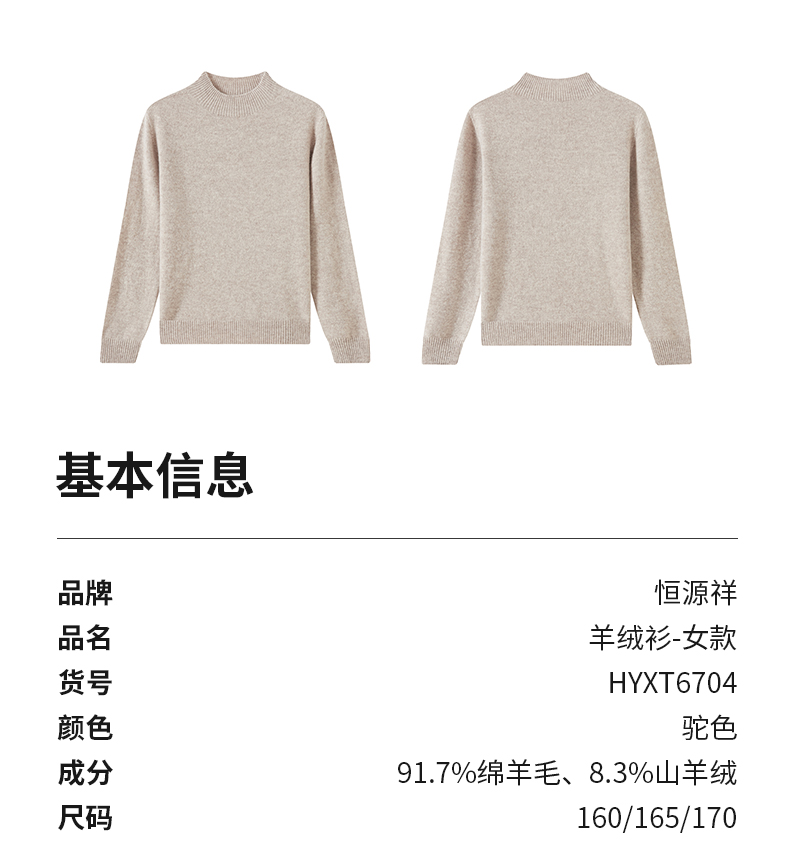商品名称:(世星阳光)+恒源祥 羊绒羊毛衫 HYXT6704 规格 160 165 170 颜色 驼色 女款 下单 备注尺码 轻盈舒适 贴身保暖