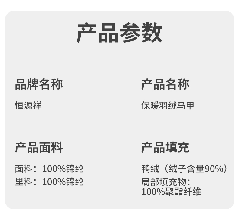 商品名称:(世星阳光)+ 恒源祥 保暖羽绒马甲 HYX220YRF 规格 S-3XL 男女通款 下单备注尺码 国标鸭绒 聚热保暖