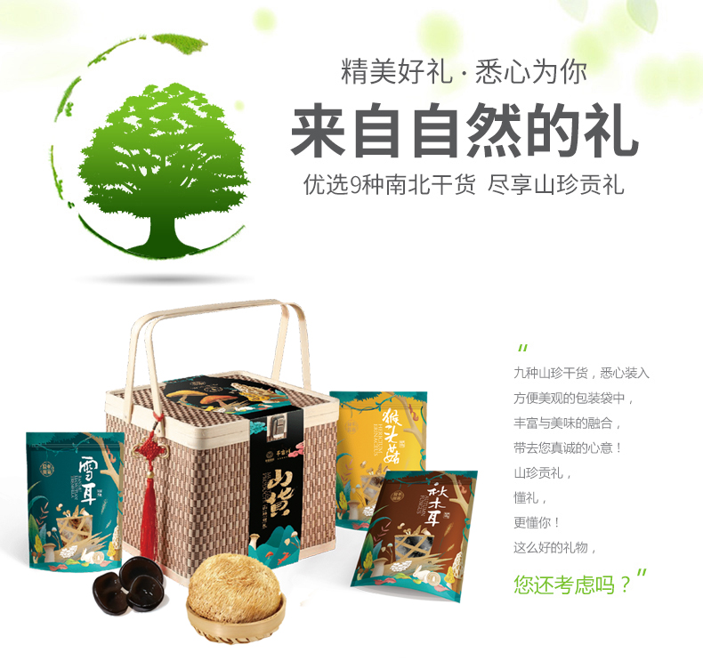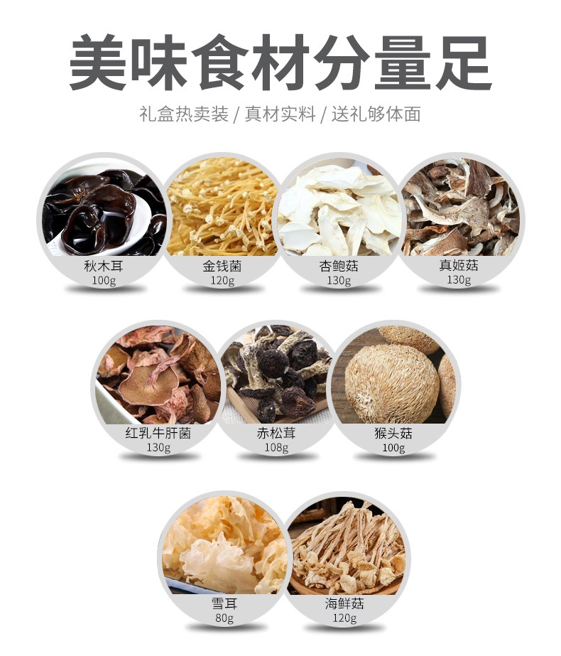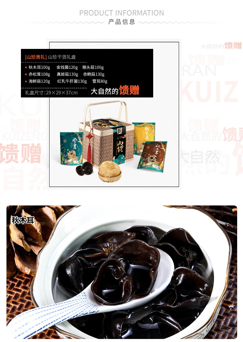 商品名称:(巨邦佑)R+半亩川山珍贡礼1018g木耳银耳猴头菇海鲜菇9拼菌菇山珍礼盒