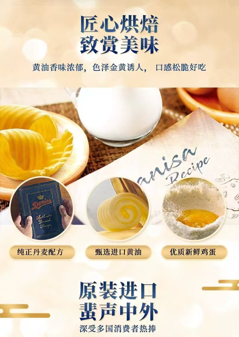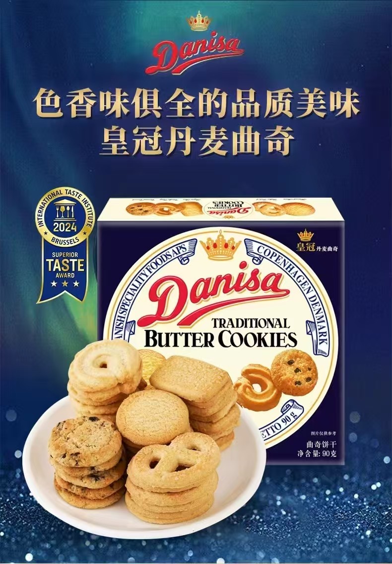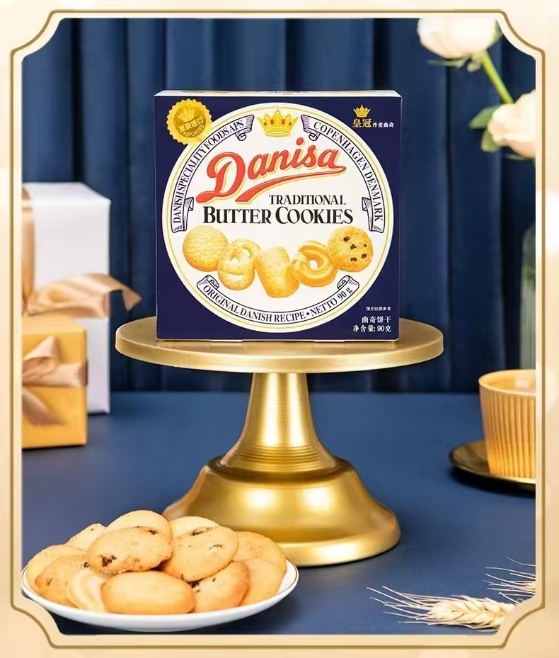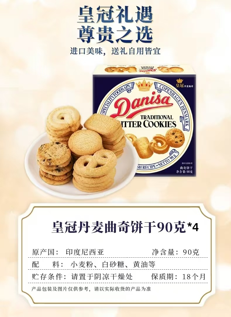 商品名称:(世星阳光)皇冠(danisa)丹麦曲奇黄油饼干原味90g*4盒 黄油香味浓郁 色泽金黄诱人 口感松脆好吃 匠心烘焙致赏美味