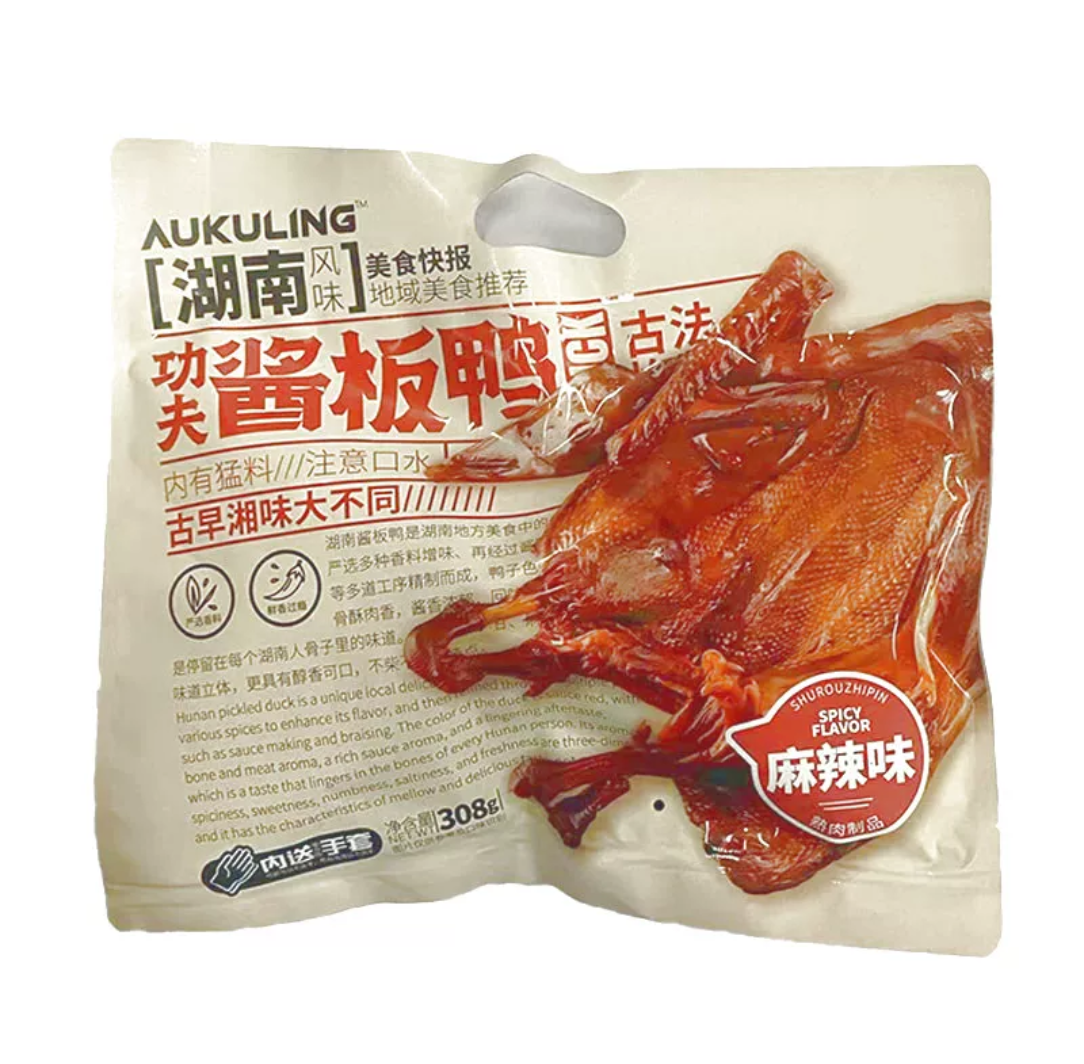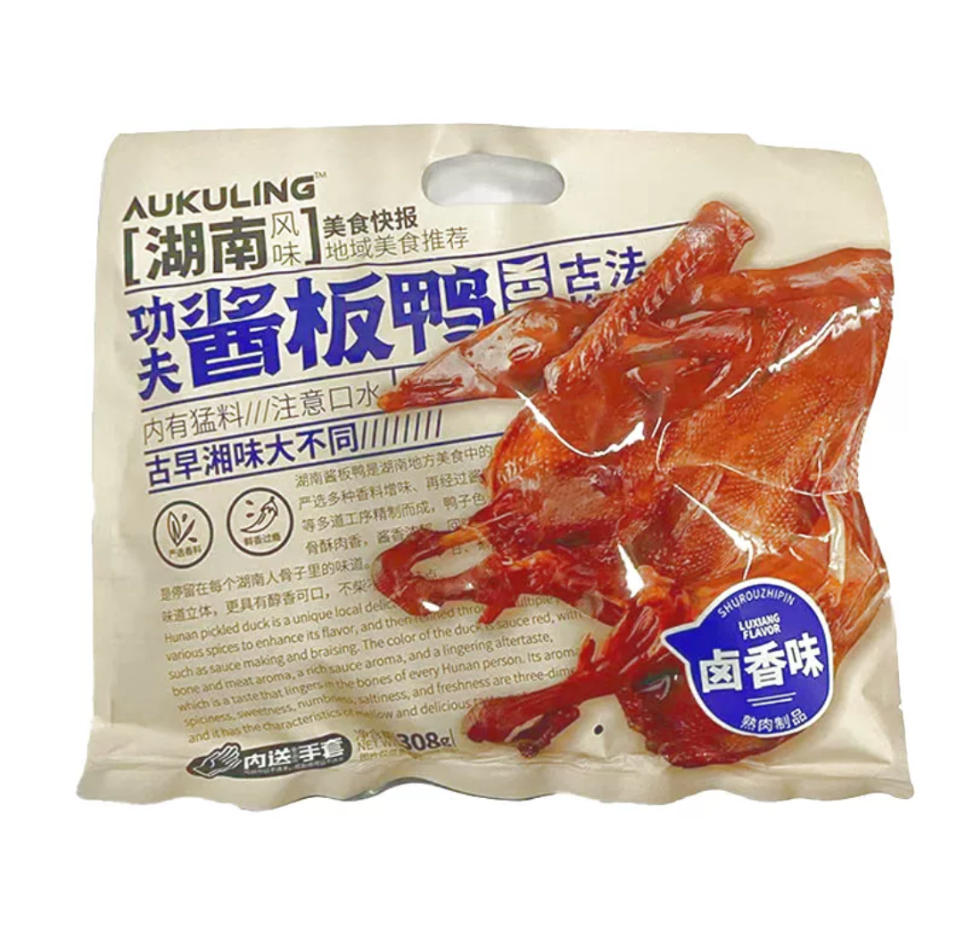 商品名称:(中百)澳谷粒酱板鸭308g*2袋,(黑鸭味、卤香味、麻辣味),口味随机,开袋即食肉食零食