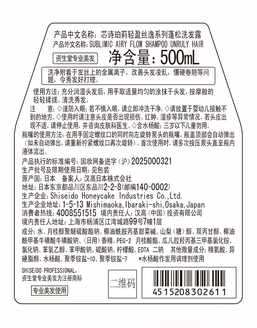 商品名称:(世星阳光)资生堂 专业美发 芯诗珀莉轻盈丝逸系 列蓬松洗发露 500ml 持久留香改善分叉