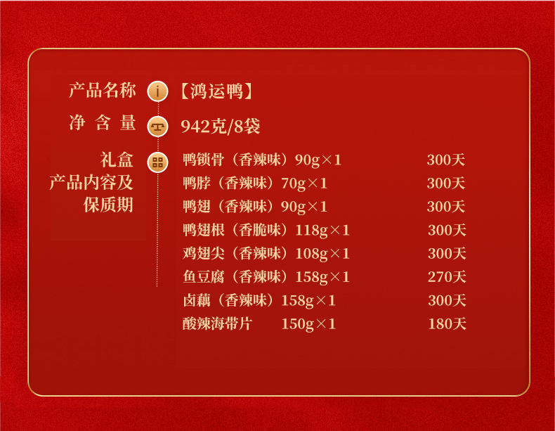 商品名称:(巨邦佑)BH+小胡鸭30年品牌卤味零食肉类礼盒熟食大礼包 小胡鸭鸿运鸭942g